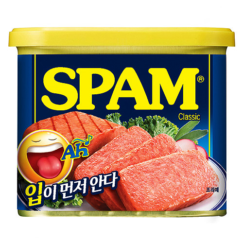"スパムとは:豚肉・ハム・芋をこねた、いわばしょっぱいハムのような物。コンビーフ型の缶詰で売られている。